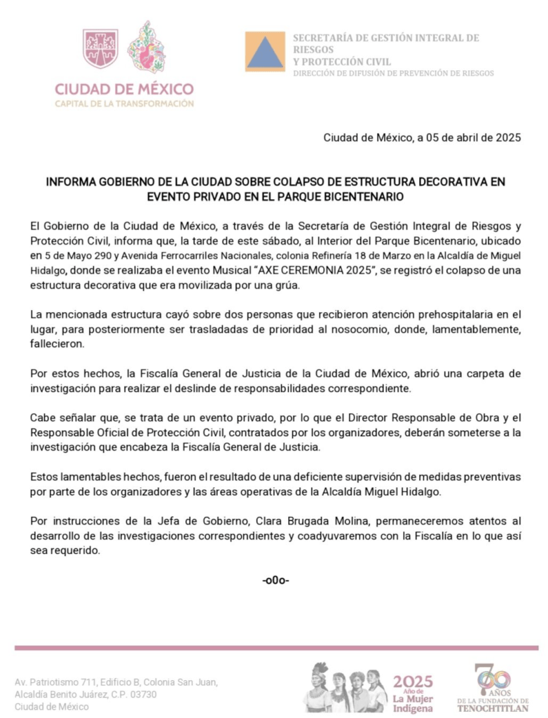Y es que, tal como dice la presidenta Sheinbaum; la Fiscalía CDMX abrió investigación contra cuatro empresas por su posible responsabilidad en el trágico accidente ocurrido durante el Festival Axe Ceremonia, el pasado 5 de abril.