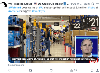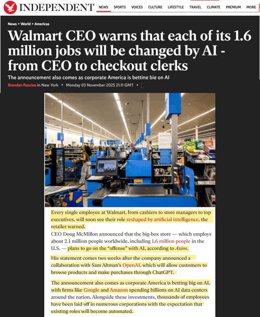 Regeneración,4 de noviembre 2025– El CEO de Walmart advierte que cada uno de sus 1,6 millones de puestos de trabajo se verá transformado por la IA, desde el CEO hasta los cajeros. El anuncio se produce en un momento en que las empresas estadounidenses están apostando fuerte por la IA.