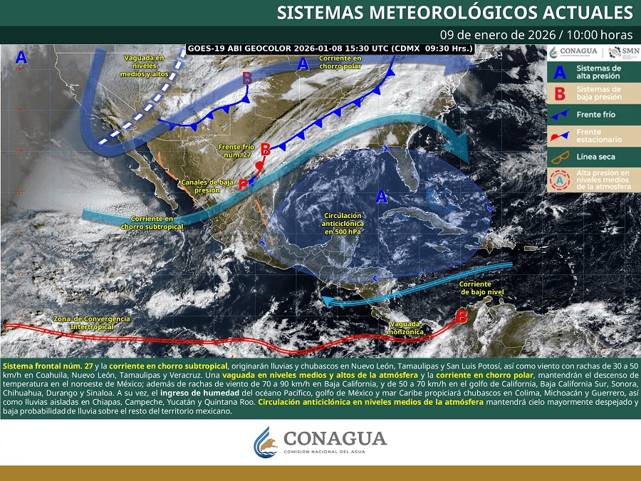 El frente frío número 27, que inició en Baja California, avanzará hacia Tamaulipas y el Golfo de México, generando la segunda tormenta invernal del año.