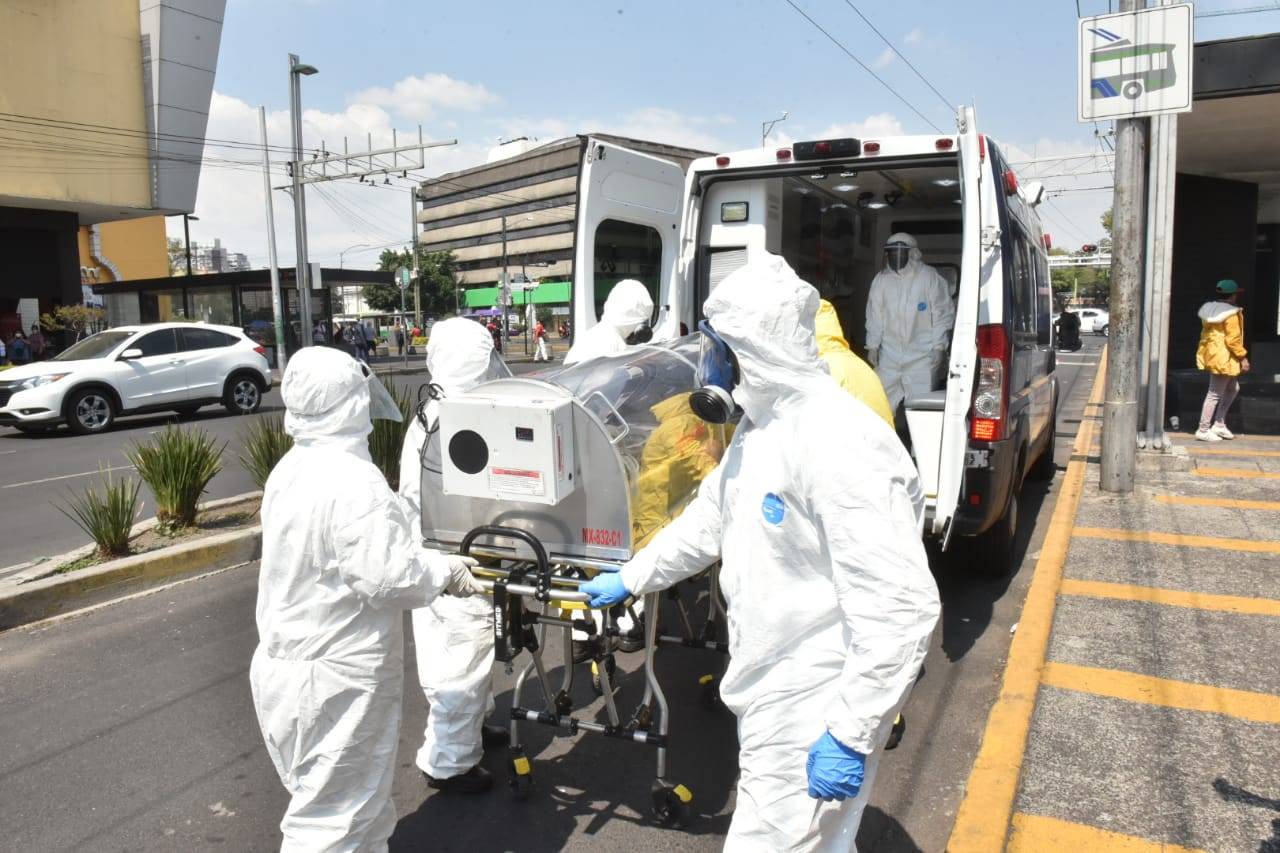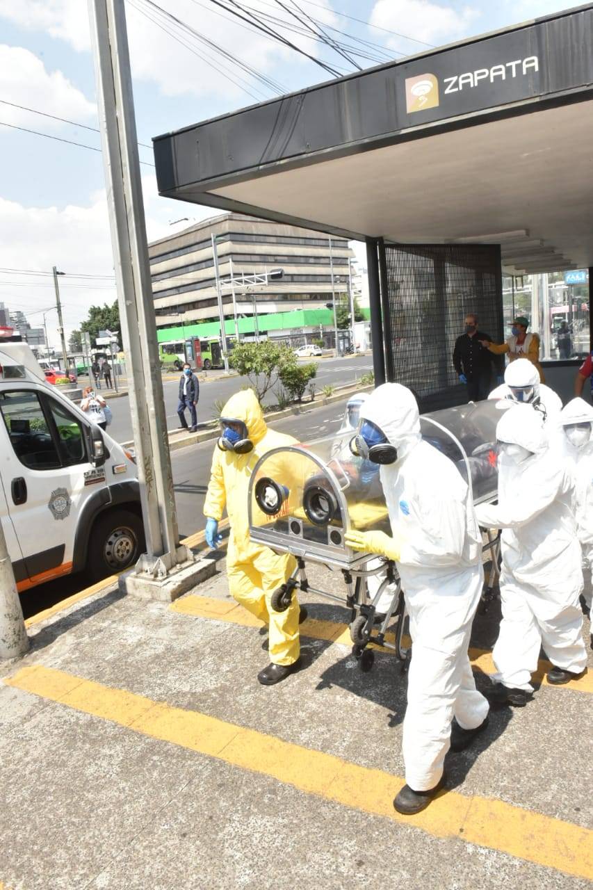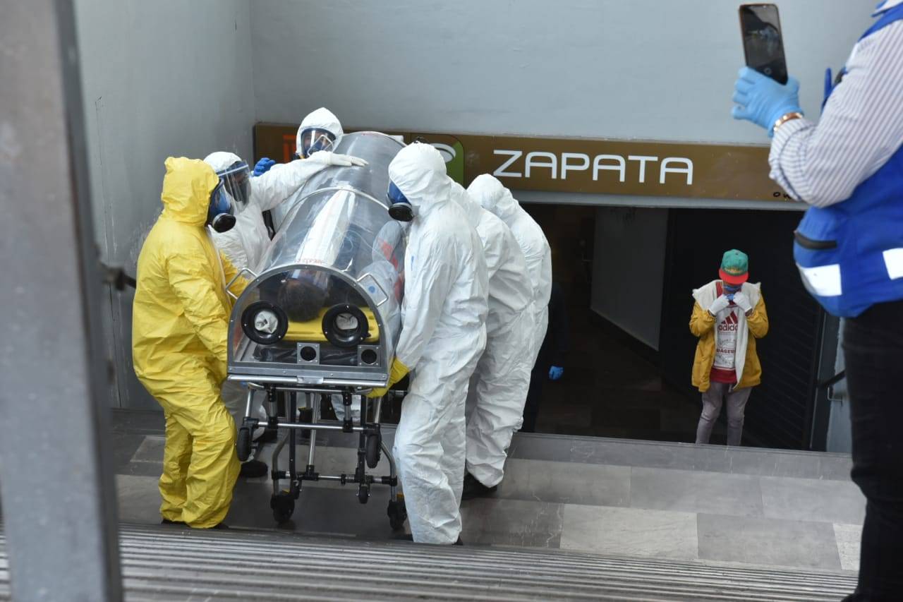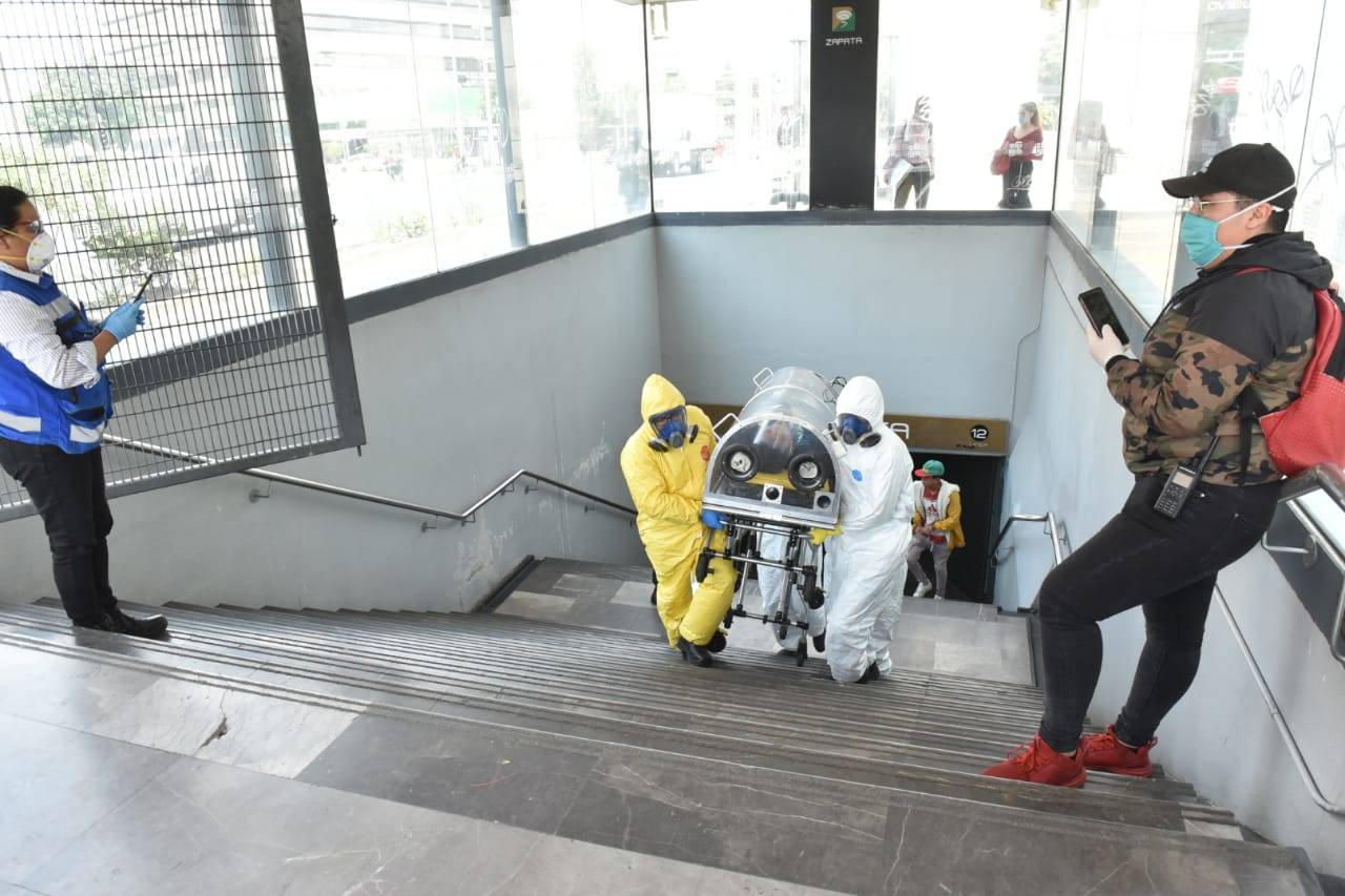 Personal paramédico del ERUM, trasladan a una persona después de presentar síntomas correspondientes a la enfermedad COVID-19 en la estación del metro Zapata de la Línea 3 del metro en la Ciudad de México.