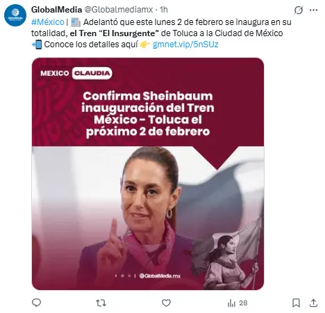 Regeneración, 28 de enero 2026– La presidenta Claudia Sheinbaum anunció que el Tren Interurbano México–Toluca comenzará a operar de Zinacantepec a Observatorio desde el 2 de febrero.