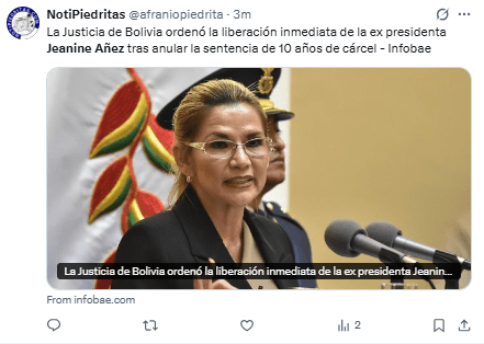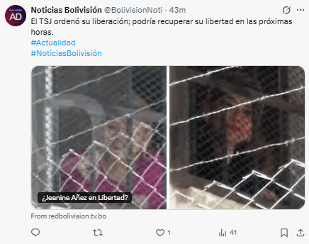 Áñez, de 58 años, no se pronunció desde sus redes sociales, aunque el martes desde la red X señaló: «Nunca voy a arrepentirme de haber servido a mi patria cuando me necesitó».