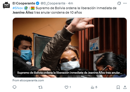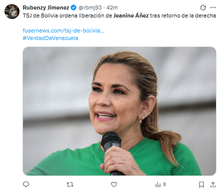 «Recibimos con esperanza la libertad de la expresidenta Áñez, su liberación simboliza el fin de una etapa de abuso», señaló.