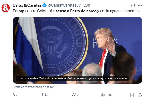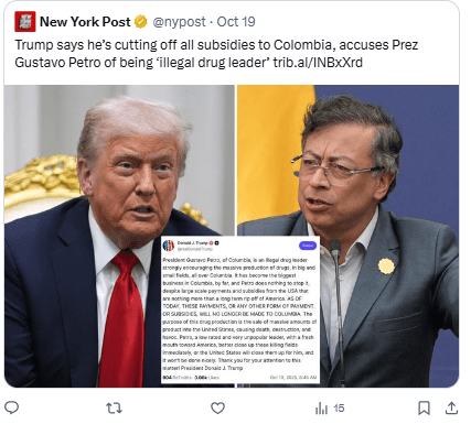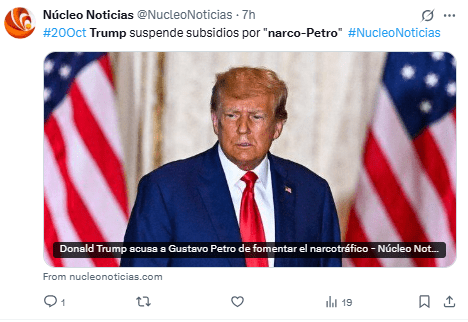 Las declaraciones fueron publicadas este domingo en su red Truth Social, anunciando también el fin de la ayuda económica a Colombia.