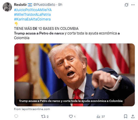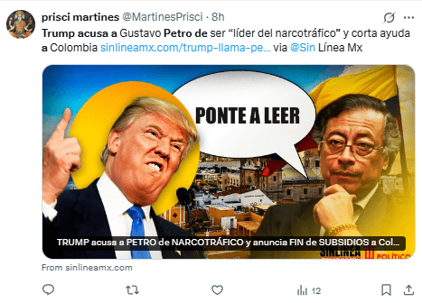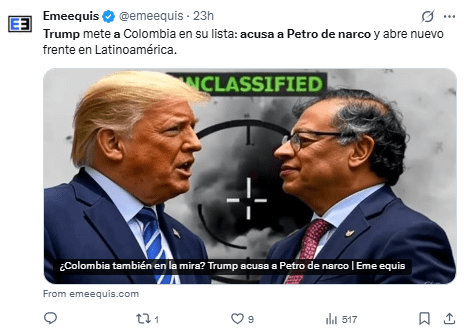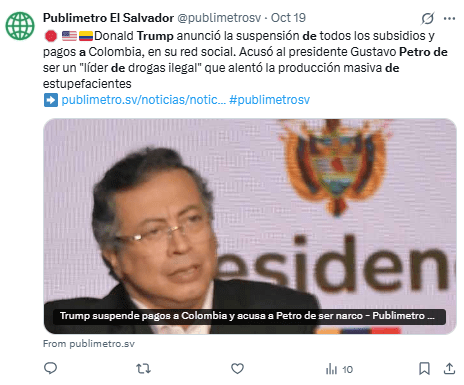 Asimismo compartió una noticia del canal estatal RTVC que señala que la lancha bombardeada el pasado 16 de septiembre en el Caribe era colombiana y que el ataque “se habría producido en aguas colombianas”.