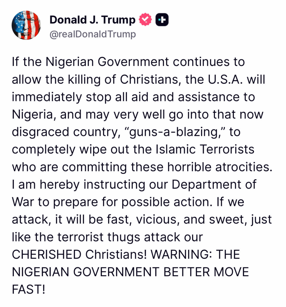 Regeneración, 3 de noviembre 2025– Nigeria está en vilo por el antiguo y controvertido tema de la supuesta persecución de cristianos y la amenaza de una acción militar del presidente de Estados Unidos, Donald Trump, algo que Abuya ha rechazado.
