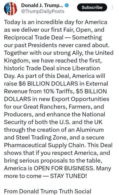 Regeneración, 8 de mayo de 2025. En redes destacan que el presidente de EE.UU., Donald Trump, anunció el primer acuerdo comercial de su segundo mandato con el Reino Unido.