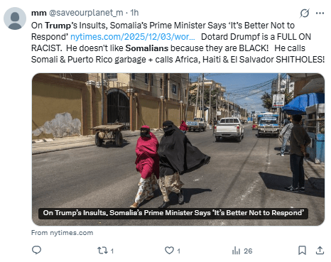 Regeneración, 3 de diciembre 2025– El presidente estadounidense, Donald Trump, acusó a los inmigrantes somalíes de aprovecharse de Estados Unidos, y lanzó insultos racistas contra esa comunidad, al decir que «su país apesta» y que él no los quiere en EE.UU.