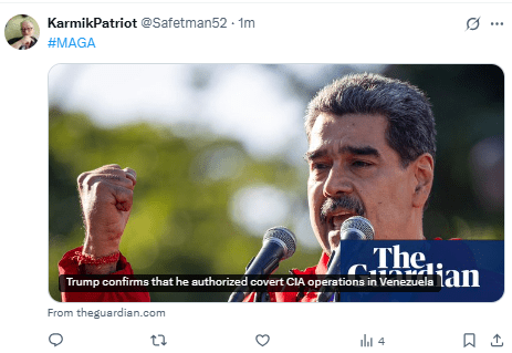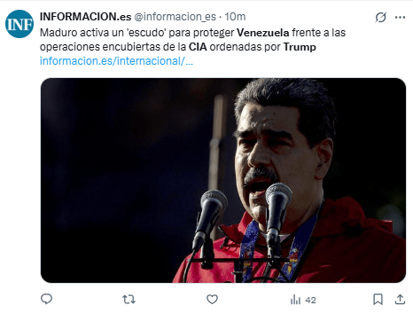 Poco después, el presidente venezolano, Nicolás Maduro, respondió con un llamado a rechazar los «golpes de Estado de la CIA» y la «guerra en el Caribe».