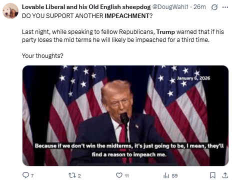 Regeneración, 7 de enero 2026– El presidente de Estados Unidos, Donald Trump, advirtió el martes a los integrantes republicanos del Congreso a que, si no ganan en las elecciones intermedias de este año, podría enfrentarse a un «juicio político» («impeachment» en inglés).