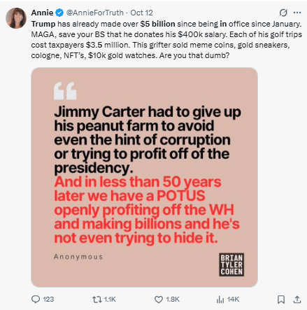 Regeneración, 13 de octubre 2025– Donald Trump, familia y amigos cercanos usan la presidencia para ganar miles de millones de dólares para sus cuentas personales al manejar el negocio del gobierno, algo que muchos acusan de ilegal y actos de corrupción.