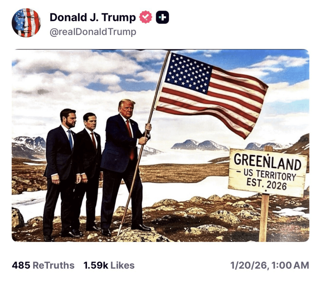 Regeneración, 20 de enero 2026– En el primer aniversario de su retorno a la Casa Blanca, Donald Trump, presidente de Estados Unidos, subió a su plataforma Truth Social dos imágenes manipuladas que muestran a Venezuela, Cuba, Canadá y Groenlandia como parte del territorio estadounidense.