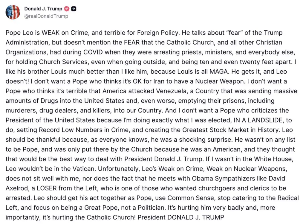 La reacción de Trump llegó luego de que el papa León XIV criticara las guerras globales el día anterior, lo que pareció ser un reproche indirecto hacia el presidente.