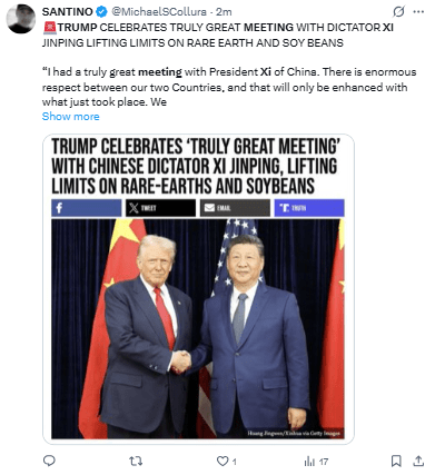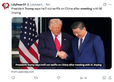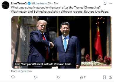 Además, indicó que reducirá del 20% al 10% los aranceles sobre los productos chinos relacionados con el fentanilo, tras su cumbre con Xi en Corea del Sur.
