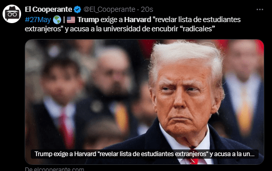 Regeneración, 27 de mayo de 2025. En redes destacan que Trump endurece las medidas para controlar a estudiantes extranjeros en Estados Unidos.