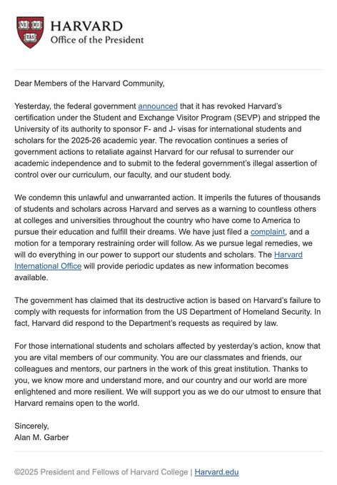 Como se sabe el gobierno de EE.UU revocó la certificación de Harvard para permitir estudiantes extranjeros, misma impugnada ante un juez.