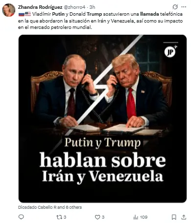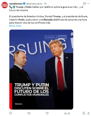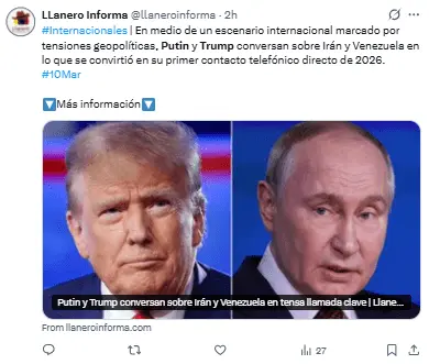 Regeneración, 10 de marzo 2026– El presidente ruso, Vladímir Putin, y el estadounidense, Donald Trump, llevaron a cabo este lunes una conversación telefónica donde trataron los conflictos de Irán y Ucrania, así como la situación en el mercado del petróleo y Venezuela, según indicó el Kremlin.