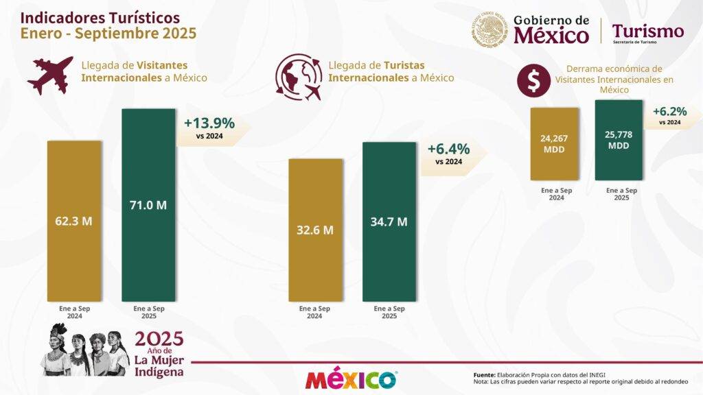 Ya que de enero a septiembre la llegada de visitantes internacionales incrementó 14 por ciento, la llegada de turistas internacionales, 6.4 por ciento y la derrama económica, 6.2 por ciento.