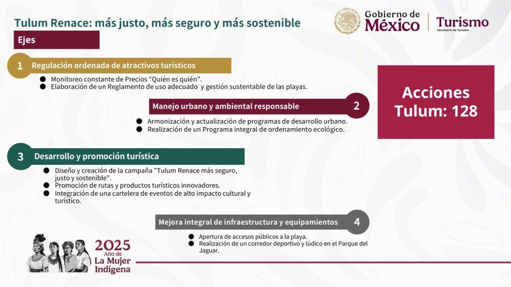 Tulum renace mas justo, seguro y sostenible. 128 acciones. Mejora integral. Manejo turístico, ambiental y desarrollo responsables