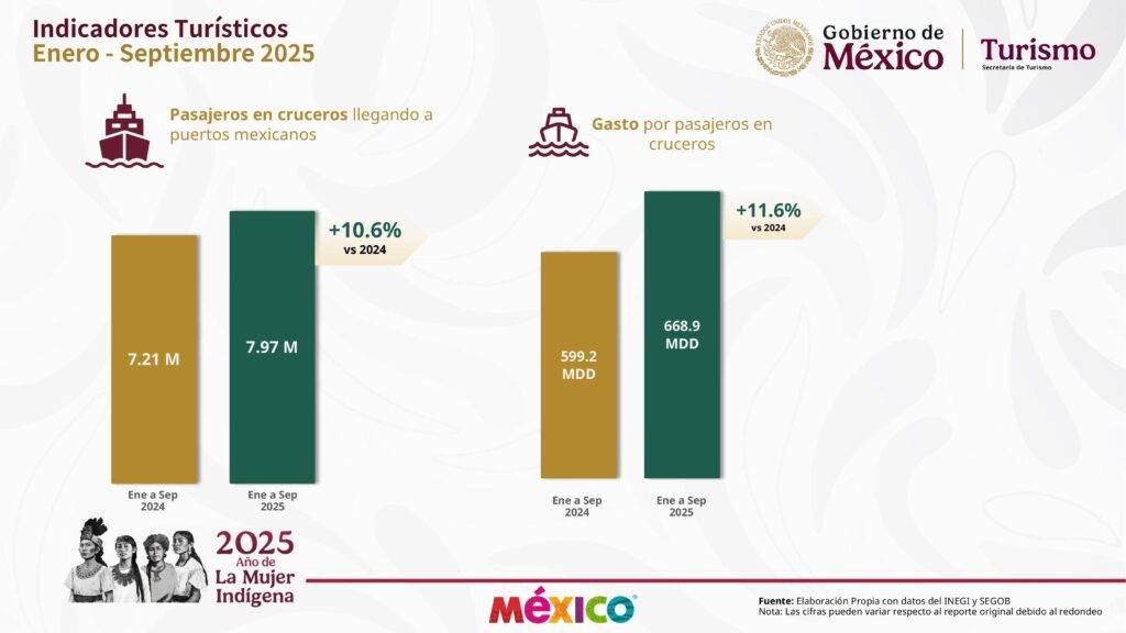 Lo que significa 25 mil 778 millones de dólares. Los pasajeros en cruceros que llegaron a puertos mexicanos aumentaron 10.6 por ciento y el gasto por pasajeros en cruceros creció en 11.6 por ciento al pasar de 599.2 mdd a 668.9 mdd, durante el mismo periodo.
