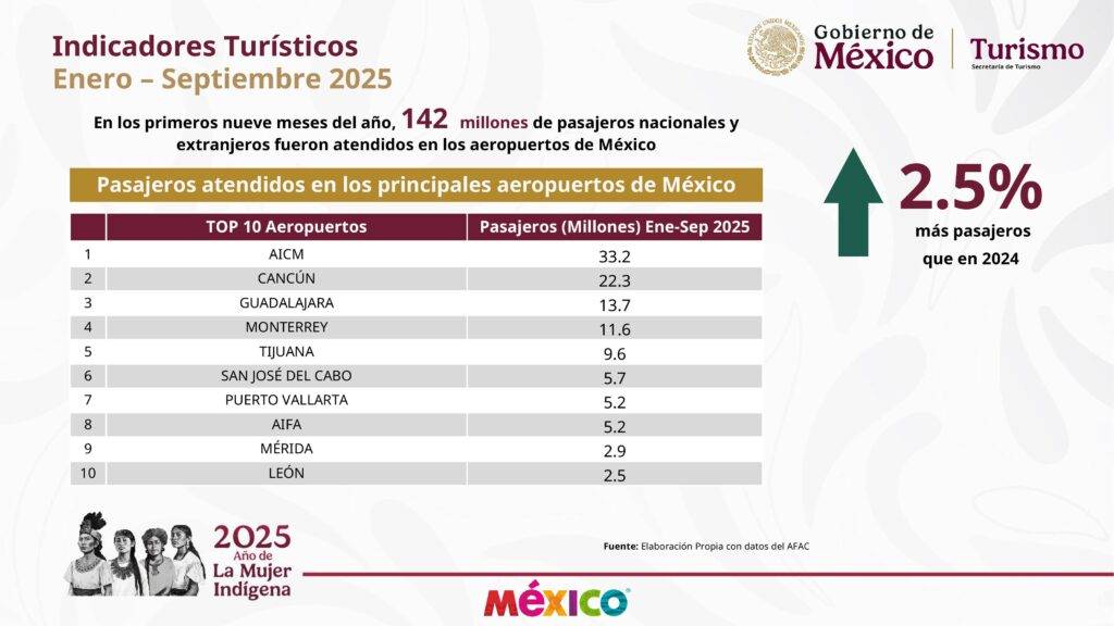 Agregó que, en los primeros nueve meses del año, 142 millones de pasajeros nacionales y extranjeros fueron atendidos en los aeropuertos de México, lo que significa 2.5 por ciento más que en 2024.