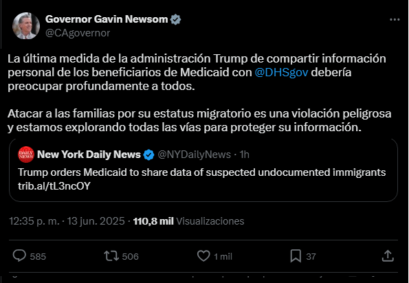 Por otra parte, se indica que «valoramos profundamente la privacidad de todos los californianos. Esta acción del gobierno federal tiene implicaciones para todas las personas que reciben Medicaid».