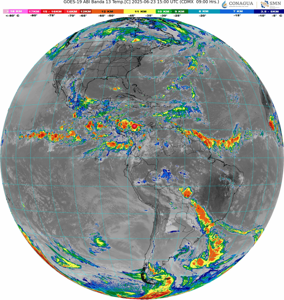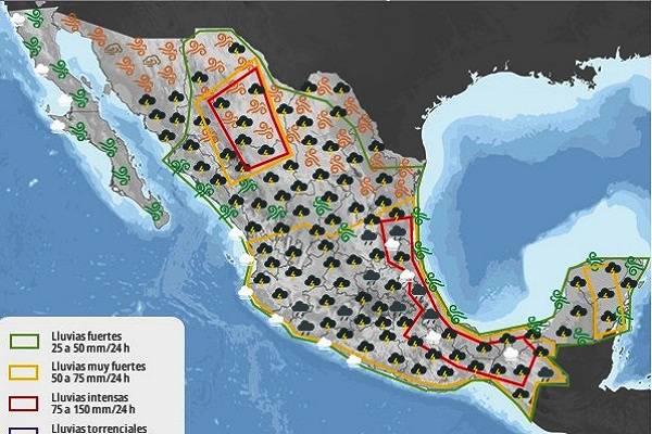 Así, se indica lluvias intensas (de 75 a 150 milímetros [mm]) para Chihuahua, Durango, Jalisco, Colima, Michoacán, Guerrero, Puebla, Oaxaca, Chiapas y Veracruz.