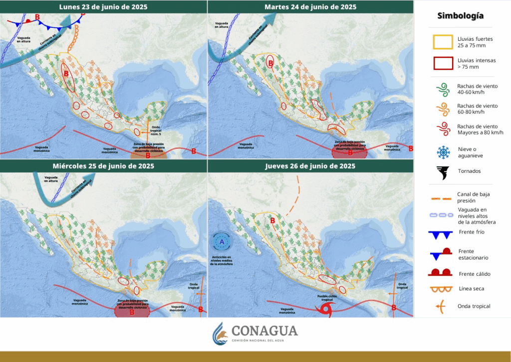 Regeneración, 23 de junio de 2025. El Servicio Meteorológico Nacional informó que continuará el temporal de lluvias en 30 entidades de la República Mexicana.
