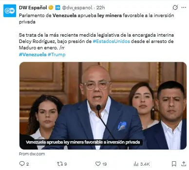 Este proyecto de ley fue promovido por Delcy Rodríguez después de la visita a Caracas del secretario de Interior de Estados Unidos, Doug Burgum.