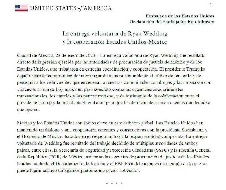 Regeneración, 26 de enero de 2026. La presidenta Sheinbaum atajó versiones y especies que circulan en redes sociales en torno a Ryan Wedding uno de los más buscados por EE.UU, quien se entregó a la embajada norteamericana en la Ciudad de México.