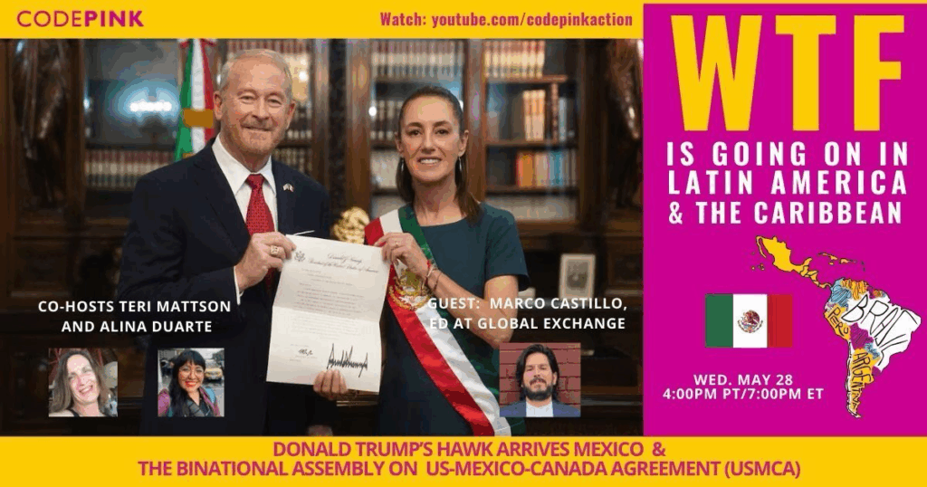This Wednesday, May 28th at 4PM PST/5PM CDMX/7PM EST the popular anti-imperialist podcast WTF is Going on in Latin America & The Caribbean? returns with a special edition of the show, live from Mexico City with co-hosts Teri Mattson and Alina Duarte, joined by guest Marco Castillo, Executive Director of Global Exchange, discussing US-Mexico relations in the context of the Trump administration’s appointment of hawk, Ronald D. Johnson, as ambassador to the country, and upcoming renegotiations of the USMCA.