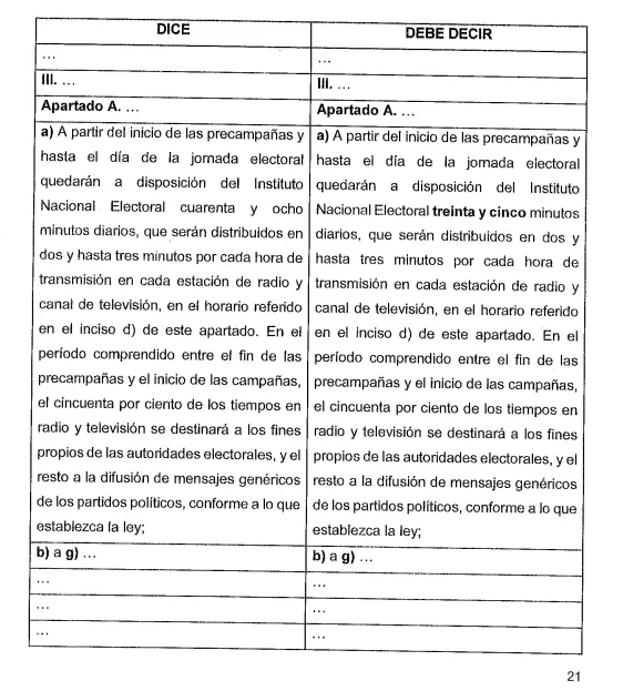 Reducir de 48 a 35 minutos los tiempos oficiales por cada 24 horas de programación en los periodos de precampaña y campaña.